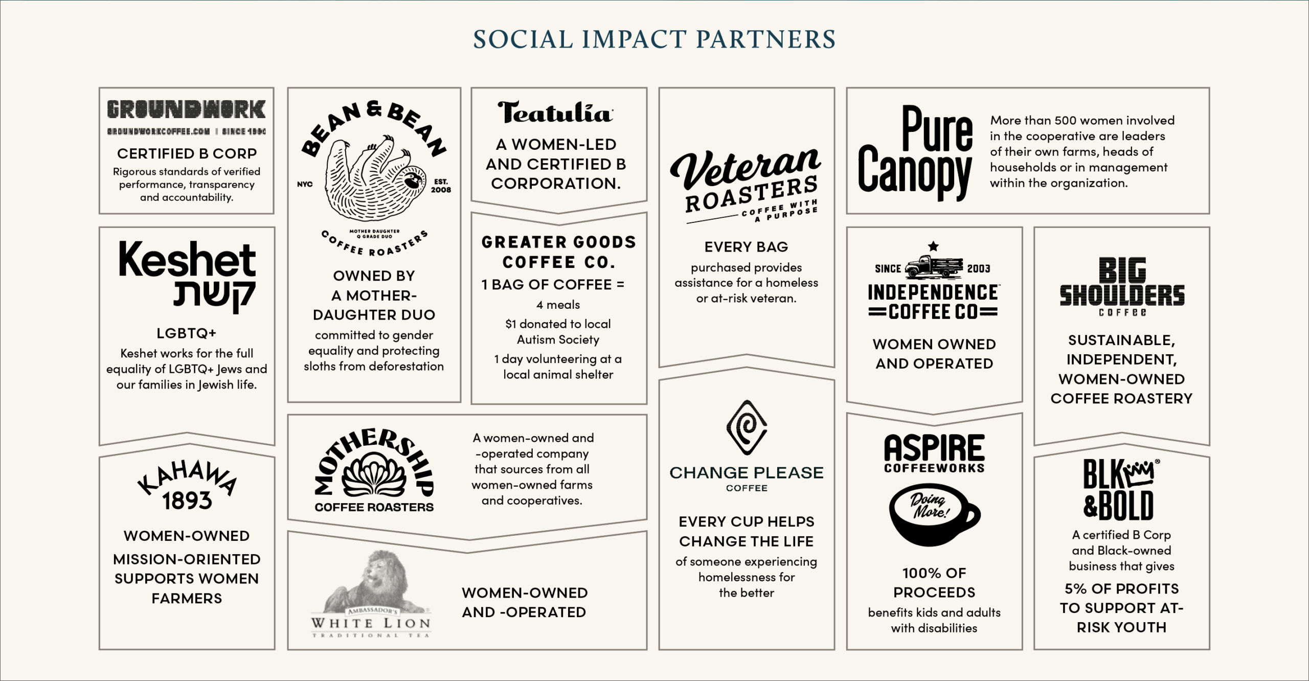 - Partners to provide documentation or insight into sourcing practices (Fair Trade, Direct Trade, Co-Op, Importer, etc.).